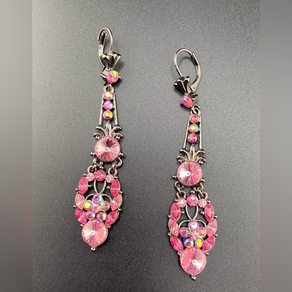 Beautiful cocktail chandelier earrings for a special night out or event. Pink and black rhinestones.