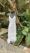 This pretty dress starts with adjustable spaghetti straps and has an eyelet circle polkadot style fabric. A fitted waist and a back zipper. The skirt extends in an a line to a ruffle him fully lined in an excellent condition.