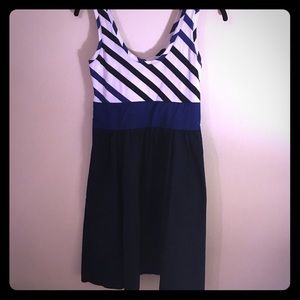 Fun navy and blue sleeveless dress. Zips on the side. Cotton, polyester, spandex blend.