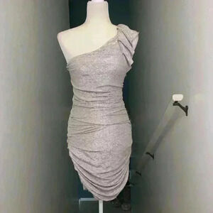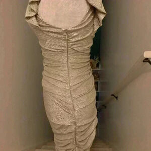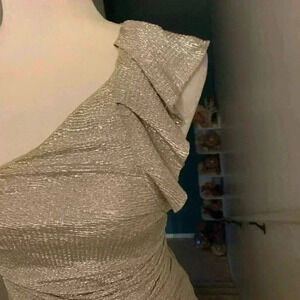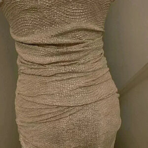 Worn once. Express gold ruched dress. One shoulder. Side zip. Very flattering fit. Size 4
