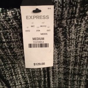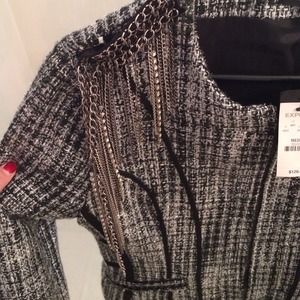 Black and white with sparkly silver. Polyester, acrylic, and wool. Has dangly silver chains from the right shoulder.