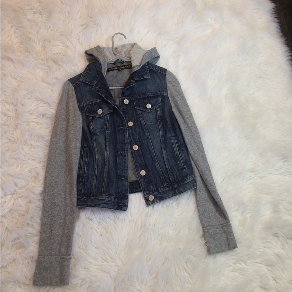 Express jean jacket with gray cotton sleeves and hood