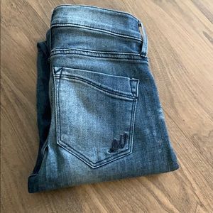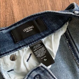 Mid rise, skinny, legging material, with holes on both knees. Soft, flexible fit. Size is 0 Regular