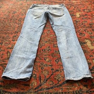 Express jeans size 6R, very good used condition. Cropped skinny mid rise style. Lighter distressed faded blue Jean. Knee holes and other manufacturer wear. Cotton spandex fabric content, they do you have a bit of stretch. Please see photos for more accurate measurements.