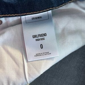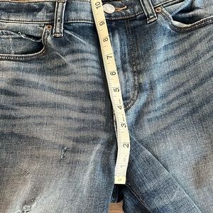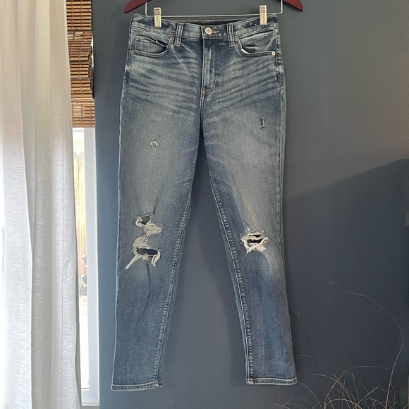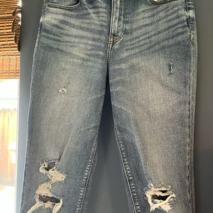 Express girlfriend high rise distressed jeans with a tie on the inside of the waist size 0