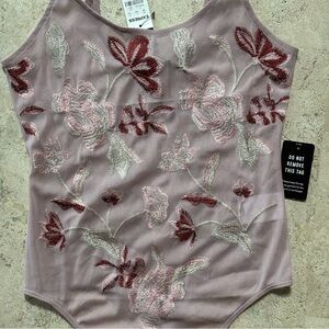 Chic bodysuit with floral embroidery. Features delicate straps and snap closure. Such a beautiful piece, would look good with a bralette under, or for a more intimate look! NWT