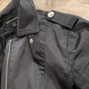 One of my faves! I like the shiny black exterior and that I can roll the cuffs for some leopard pizazz. Zip closure. Cotton poly spandex. Front pockets. 17.5” across bust and 20” long.