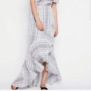 Beautiful blue and cream off the shoulder maxi dress, ruffle tier front, lined