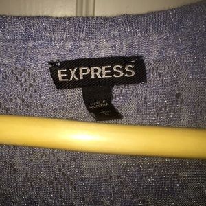 This shirt is very lightweight, has some stretch to it, and works well with a tank top underneath. It is a light blue-gray color with silver threading that gives it a pretty sheen.