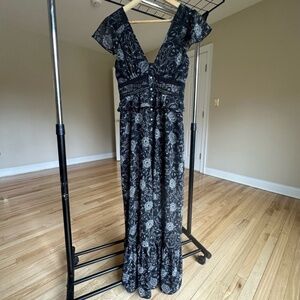 A sweeping silhouette that's suited for a casually elegant weekend wedding, date night or sunny vacay. Ladder lace and buttons accentuate the beauty of the plunging cut, while partial silky lining and airy chiffon keep your look cool and breezy.