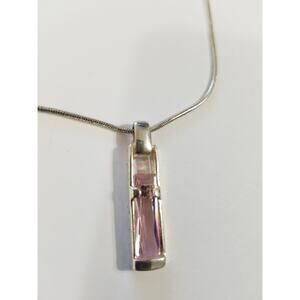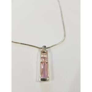 Add a touch of elegance to your outfit with this beautiful Express necklace. The silver-colored chain and rectangle-shaped pendant with pink stones make it a perfect accessory for any occasion. The necklace is designed to showcase the beauty in simplicity, and it is a great addition to any jewelry collection. The pendant hangs delicately from the chain, giving it a sophisticated look. This necklace is perfect for those who appreciate the finer things in life and want to add a touch of glamour to their wardrobe. n201*