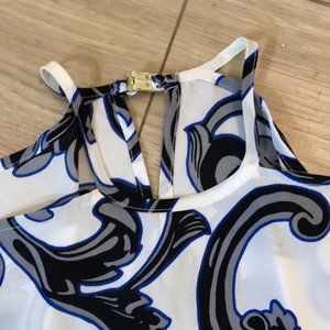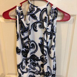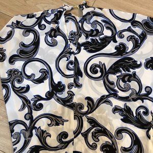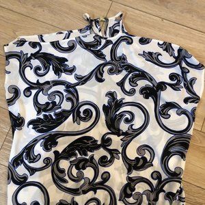 In Great condition- this sheer white top has open shoulders and come a quarter of the way down. The shirt clasps around the neck into a stretch band it goes into. The Print is a vine like design with black, gray and blue outlines. This goes great for an outing or event. Even as a summer top for the night. Worn just a handful of times. no tears or stains. Included an old photo of me wearing the top.