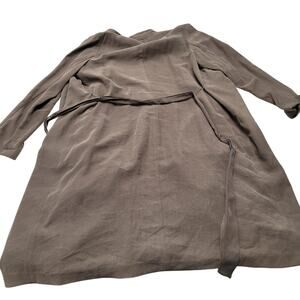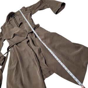 Stylish Express midi length trench coat! Wrap design with moto zip pockets in a olive green color (Darker, almost brown). Jacket has a few tiny marks on the front and a few on one sleeve. Size large