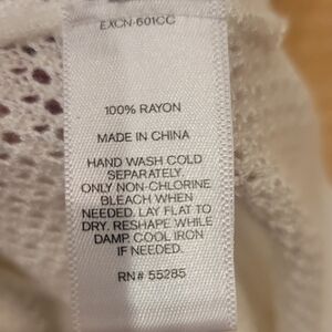 Open knit, see through, 3/4 length sleeve, cold shoulder, light weight. Great for over a bandeau top or tank. Nice layering piece. Size small. stretchy. tunic length.