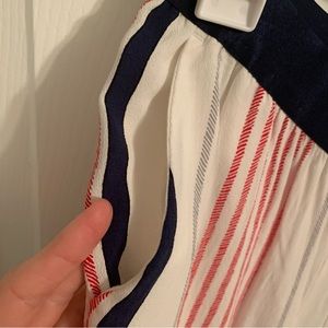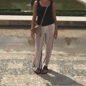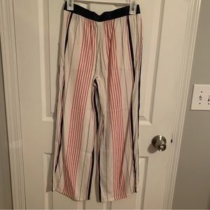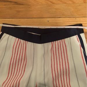 Express wide leg pants in soft flowy material. Size petite extra small. Navy blue satin stretchy waistband, red, gray, and navy blue stripes going down the pants. Worn once.