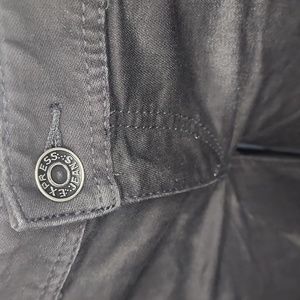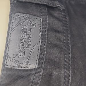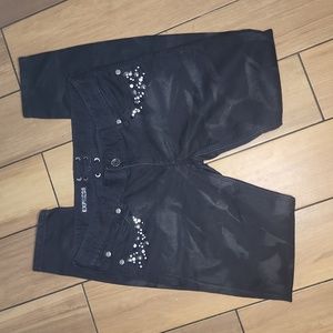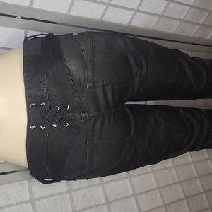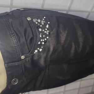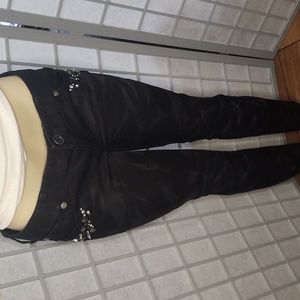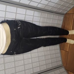 Size: 10. In great condition. Color: Black with a light white wash to them. There's a corset style in the back if the pants. These are very soft and comfortable. There are rhinestones on each of the front pockets. These pants are skinny jeans.