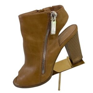 These shoes are in good condition! A little wear on the back of the left heel is shown in picture. Inner functional zipper with a silver outer zipper for embellishment. Block wood 3 1/4” heel. Perfect with a pair of leggings or jeans!