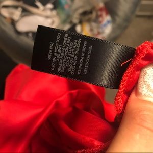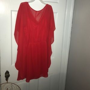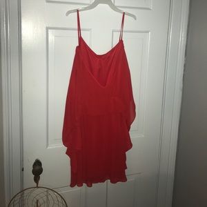 Double layered red dress from Express. It has spaghetti straps with the base layer and then a sheer layer over it that is cinched at the waist to add some shape. Flowy and comfy! Only worn once! I am also 5'7 and it was about as long as my fingertips!