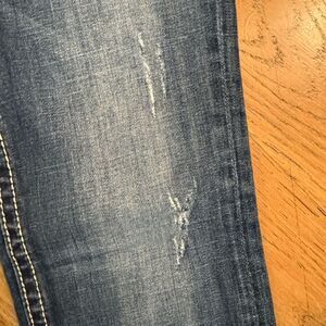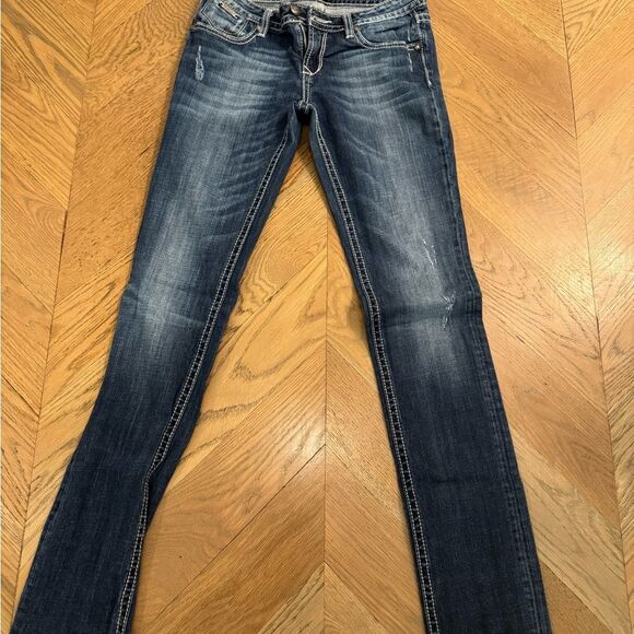 Elevate your style with these sleek dark blue skinny jeans. Perfect for any occasion. Excellent condition. 6 long. Supermodel type pants. Similar style to rock revival
