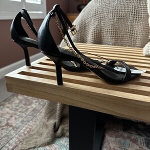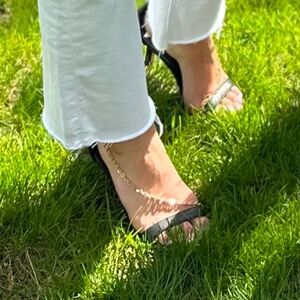 Elegant Square toe heeled sandals • Strap across the toes; ankle strap, Chain across the foot • Mid heeled sandal; Thin heel • Adjustable ankle clasp closure • 2.55"' heel