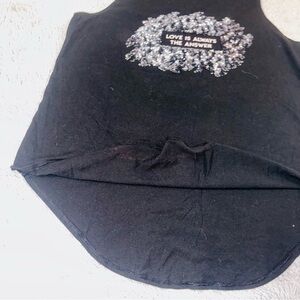 Super cute top with a dolphin hemline, sleeveless, and sequin decoration in middle “love is always the answer” quote, small stain on interior of shirt but as pictured not noticeable on the outside of the shirt .