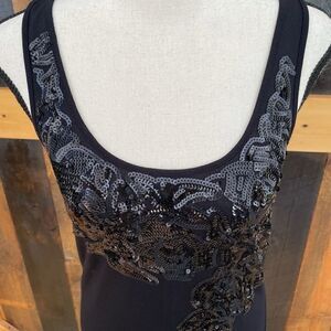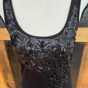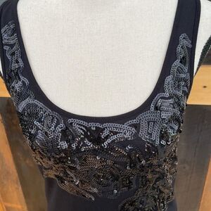 Express black jersey sequin front tank top. 100% rayon soft jersey, round neckline. Great top to dress up or down. Approximate measurements are pit to pit flat 15.5”, length from shoulder approximately 27.5”.
