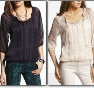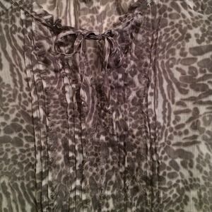 Sheer white and gray animal print top. Has small slit with tie at neckline. Cute small ruffle all the way around neckline. Pleats down center of front with lightly frayed edges. Elbow length sleeves with elastic at ends. Elastic at waist. Gently used, I good condition. Has small irregular stitching on one sleeve as shown in 4th photo.