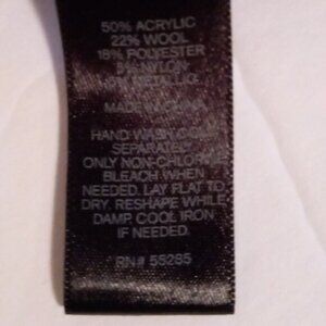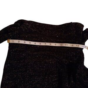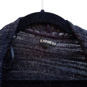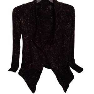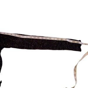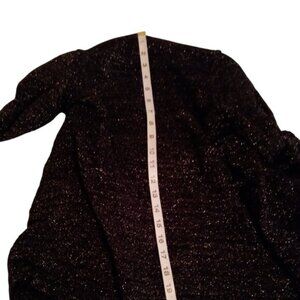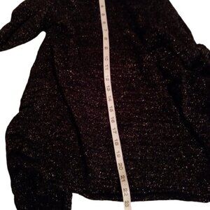 In good preowned condition. Awesome asymmetrical design and silver shimmer. Great for layering and to attend a party. Silver threading throughout knitting. Lightweight. Made of 50% acrylic, 22% wool, polyester, nylon & metallic. Measures: back armpit to armpit 17", back top to bottom 24 1/2", sleeve 28". Natural curling on hem. Photos #1 and #3 taken in brighter lighting to show detail. From a smoke free and cat/dog friendly home. #(7)