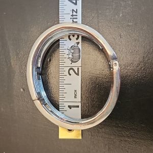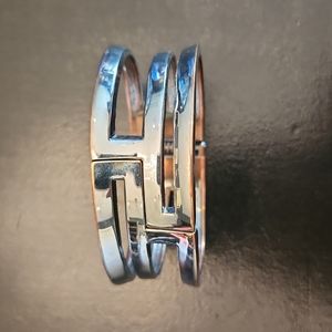 Silver petite bangle from Express. There is tarnish along the edges and on the inner components, but is still a striking piece.