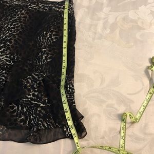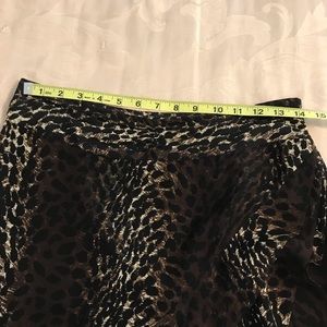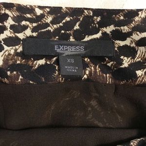Very cute Express skirt. I think rayon material light weight flowing material with over lap in the front. Extra small size, animal print. Brown and black. Side zipper.