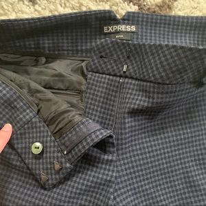 Express slacks with a navy gingham pattern. Straight/wide pant leg. They are not flare. Editorial style.
