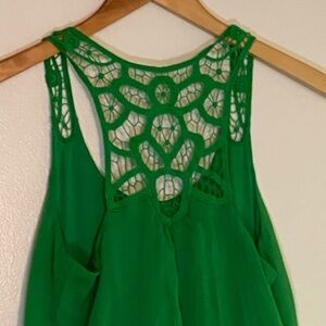Emerald green; sleeveless; scoop neck; crochet detail along shoulder straps and racerback; elastic waist; fully lined