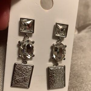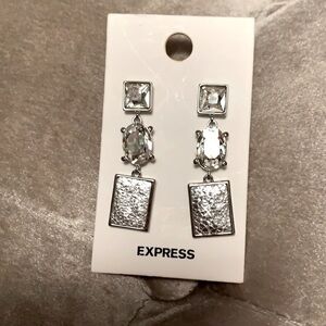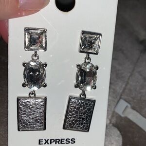 everybody loves how express brand jewelry sparkles. These are a fabulous pair of earrings that are about 2 inches in total length and feature a square at the top and then an oval and then a rectangle. The rectangle is a hammered looking piece and the top two pieces are super sparkly in the right light. Unfortunately my pictures do not show the sparkle at all. Brand new on card, great for gifting, or for yourself. New with tags, never worn.