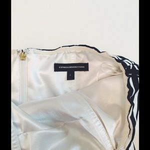 White with black striped pattern. Lined. Falls above the knee with back zip.