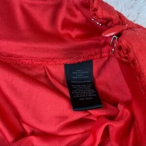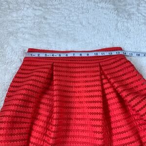 Cherry Red fit and flare skirt with mesh overlay and side zip closure. Not much stretch, and no pockets.