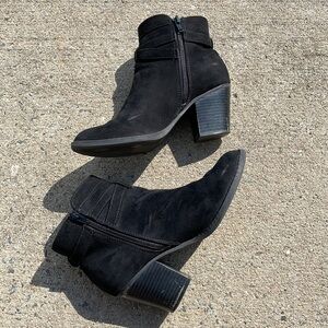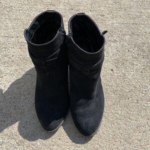 Inner zipper Block heel shows some scuffs and signs or wear Buckle detail at ankle