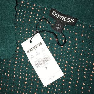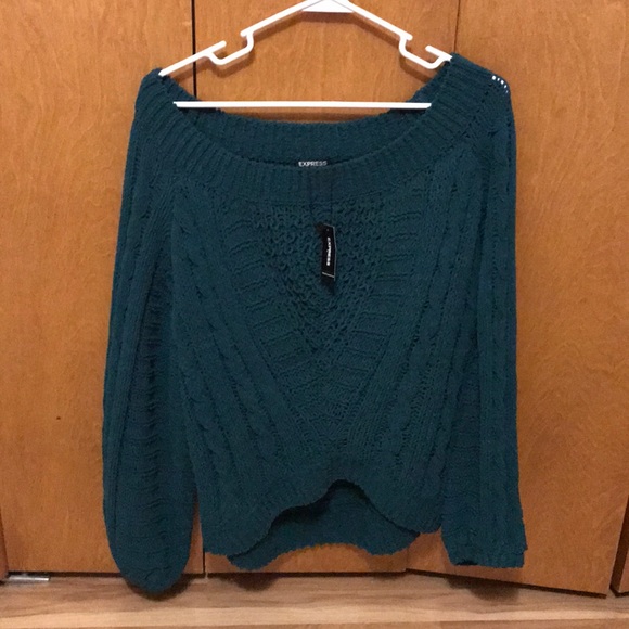Size medium off the shoulder loose sweater from express. deep green color. very soft and detailed knitted material. Brand new with tags!