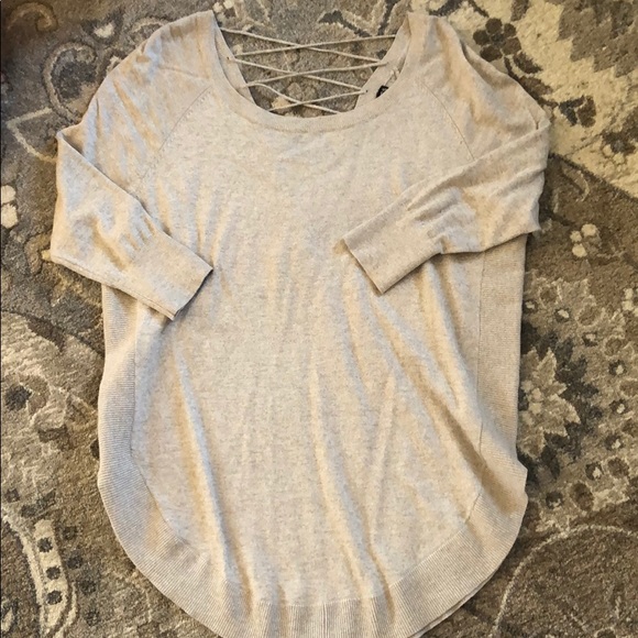 Tan 3/4 length sleeve soft sweater. Open back detailing. Very soft material. Swoop hemline