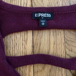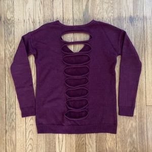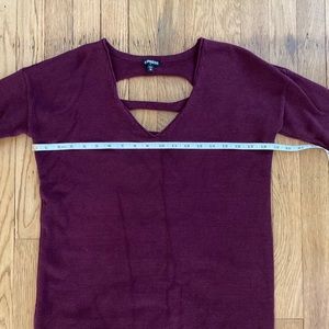 V-neck sweater with open back detailing. Maroon/burgundy color. Excellent condition, worn a few times. Runs large, fits more like a small.