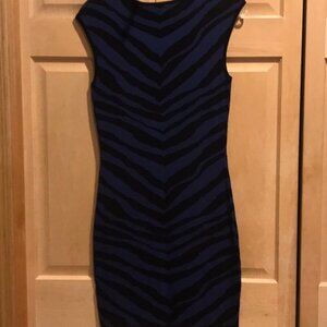 Express sleeveless sweater knit dress. Slight signs of wear- not really noticeable. Rounded neckline. Blue & black stripes. Stretchy. 80% rayon, 17% nylon, & 3% spandex.