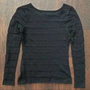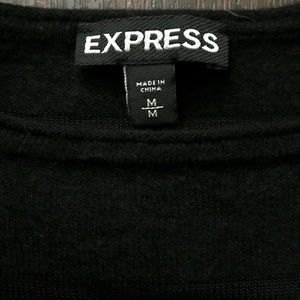 Marked size medium but fits like a size small compared to my other Express tops (I normally wear small at express and this fits well). Solid black with somewhat sheer stripes. Overall good condition with a little bit of fuzzing starting to form.