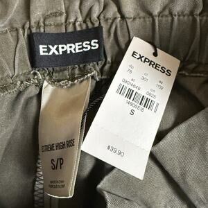 Chic and comfortable, these Express paperbag shorts feature a flattering high-rise waist with an adjustable matching belt. The olive green tone gives a neutral, earthy style that pairs effortlessly with basics or summer layers. Soft linen blend fabric offers breathability and style. Includes elasticized waistband, side pockets, and pleated front. Labeled size S/P.