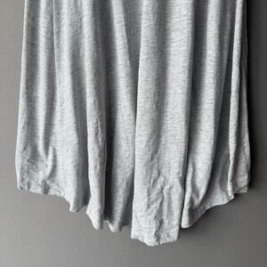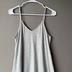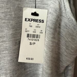 This is an Express brand dress, new with tags. The dress is light gray and features a V-neck and adjustable straps. It is made of 60% cotton and 40% modal. The dress is a size small. The original price tag shows