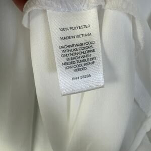 This is an Express white dress, size S/P, new with tags. The dress features a halter neckline with gold-tone straps and a sleeveless design. It has a flowy, asymmetrical hemline. The material is 100% polyester. The dress is in new condition, with the original tag still attached, indicating a retail price of $88.00. There are no visible imperfections.