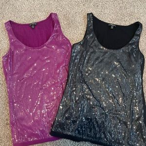 Express tank top bundle (2). One magenta and one black. Both have sequin fronts. Silver sequin detailing with sheer overlay. Cotton back. Scoop necks. Cute and stylish for work or play. Both size xsmall. EUC. No flaws.