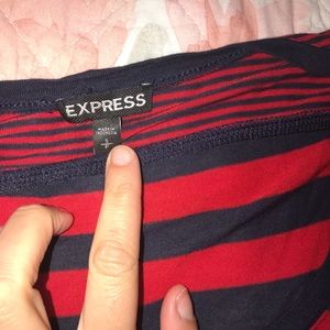 Red and blue striped express tee. There is a hole in the front but very small- posted.