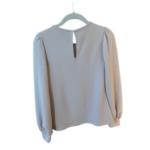 Classic and elegant Express long sleeve blouse in a soft light beige/cream shade. Features a textured woven fabric with subtle puffed shoulders for a feminine silhouette. Rounded neckline, long sleeves with gathered cuffs, and a keyhole button closure at the back.