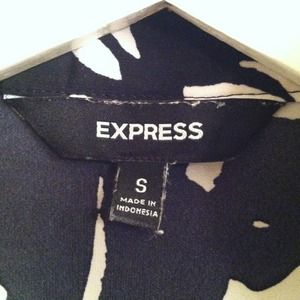 Black and white print express top. Sleeveless with a slight collar. Has a ruffle in the front and slimming gathering.