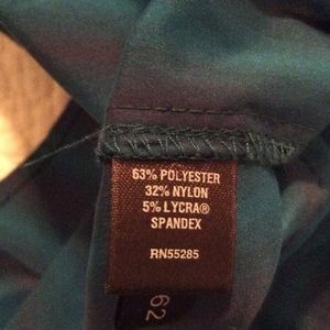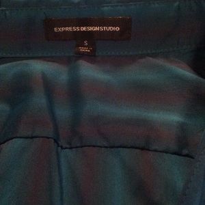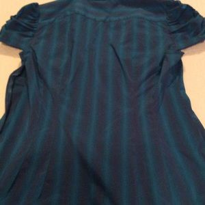 Express top, collared mock button down, short gathered sleeves, side zipper. Teal with blends of maroon.