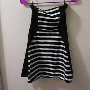 Black and white stripe. Has black down either side. Tight on top and flares towards bottom. I wore this as a top with dark jeans and boots. Was sold as a dress. Size xs. Very cute for a sexy date night